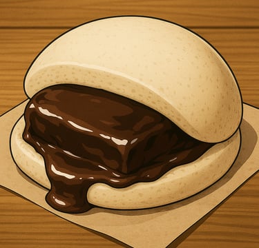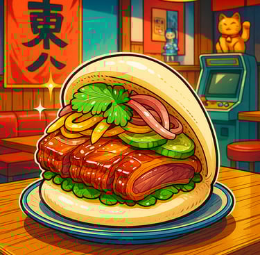 pan al vapor relleno de panceta asada pepinillo y cebolla encurtida.