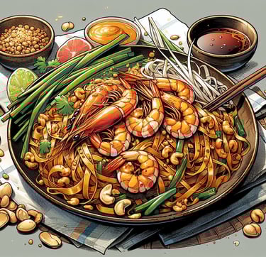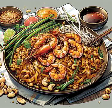 Fideos de arroz salteados con pollo y gambas, en una salsa de tamarindo, coronados con cacahuetes, hierbabuena, lima y brotes frescos para un toque auténtico y refrescante.