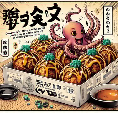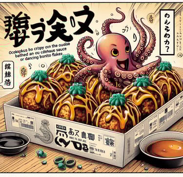 Bocaditos de pulpo, bañados en salsa de anguila y nuestra atrevida salsa "Que te den", con copos de bonito que no paran de moverse... !Como un Magikarp usando Salpicadura¡ No hacen nada, pero te alegran el plato.