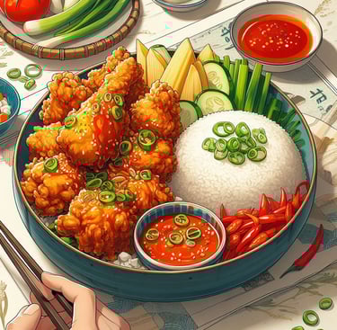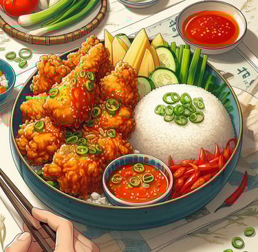 Pollo frito al estilo japonés crujiente, acompañado de arroz coreano, encurtidos, cebolleta china y una salsa spicy que le da el toque perfecto.