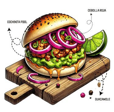 Pan al vapor relleno de cerdo cocido a baja temperatura con salsa pibil. guacamoles y cebolla encurtida