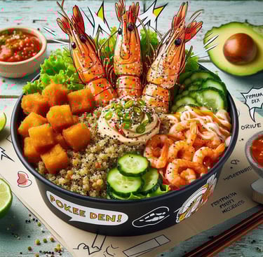 gamba crujiente sobre una base de arroz, con mayonesa de spicy, vegetales frescos y encurtidos para una explosión de frescura y sabor.