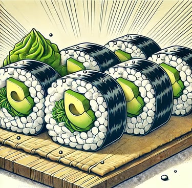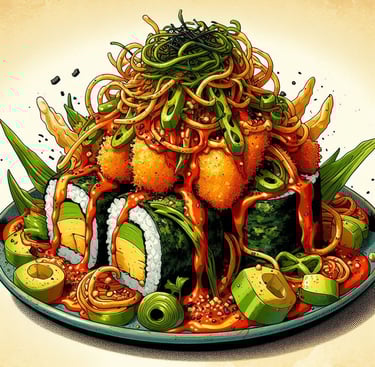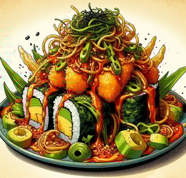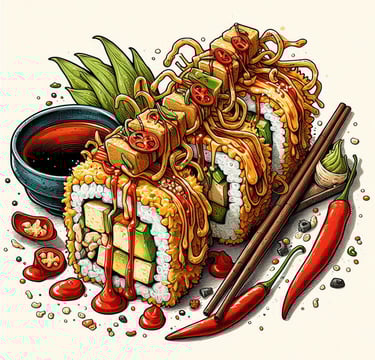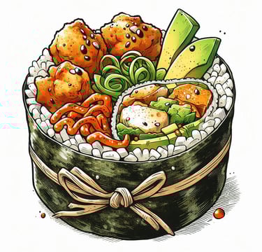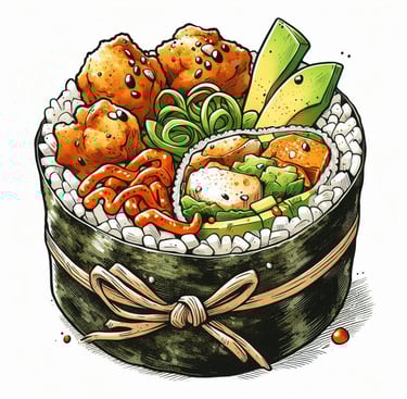 ¡Sushi y burrito fusionados en una sola explosión de sabor! Pollo jugoso, maíz , wakame, aguacate, cebolla crujiente envueltos en un mega rollazo que te hará flipar.